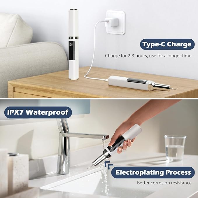 • FULLL SET TEETH CLEANING KIT: There are 1 ultrasonic machine,2 cleaning head(made of 304stainless steel),1 silicone toothbrush, 2 silicone hand brush in the package. Just buy this cleaning kit combination, you will get almost all you need to take care of your pet’s tooth in daily life.No need to spend money to the hospital. Save your money and your precious time.Avoid plague,tartar or any other oral disease of your pet.In deed a very functional tartar remover for pet teeth.