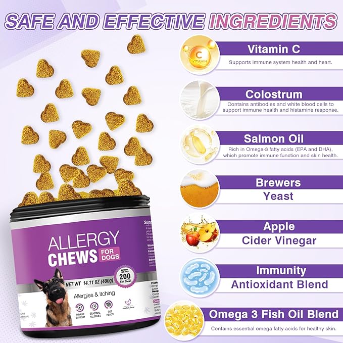 • [Multifunctional Pet Allergy Chews]Itch and allergy chew for dogs contain a variety of ingredients that can not only help dog allergy relief, but also maintain dog health. Advanced dog skin allergies treatment provide dogs with extra TLC to support health. Colostrum and vitamins of dog itch relief chew help dogs maintain a healthy immune system and heart, and probiotics balance intestinal flora. Allergy dog chews enhance pet's immunity, itchy dog relief, and reduce discomfort caused by allergic.