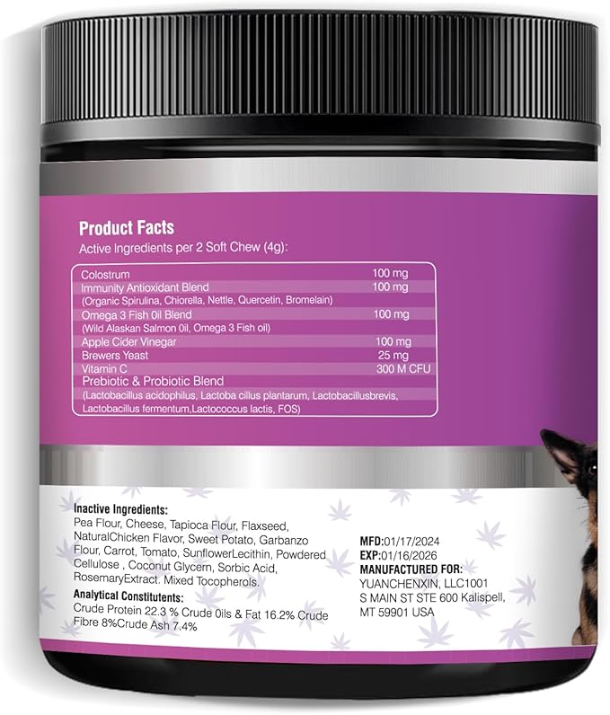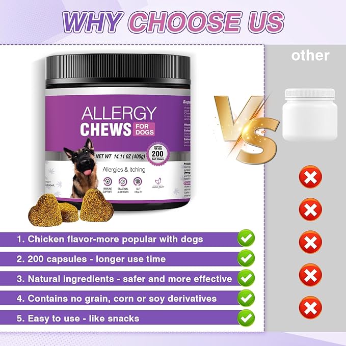 • [Multifunctional Pet Allergy Chews]Itch and allergy chew for dogs contain a variety of ingredients that can not only help dog allergy relief, but also maintain dog health. Advanced dog skin allergies treatment provide dogs with extra TLC to support health. Colostrum and vitamins of dog itch relief chew help dogs maintain a healthy immune system and heart, and probiotics balance intestinal flora. Allergy dog chews enhance pet's immunity, itchy dog relief, and reduce discomfort caused by allergic.