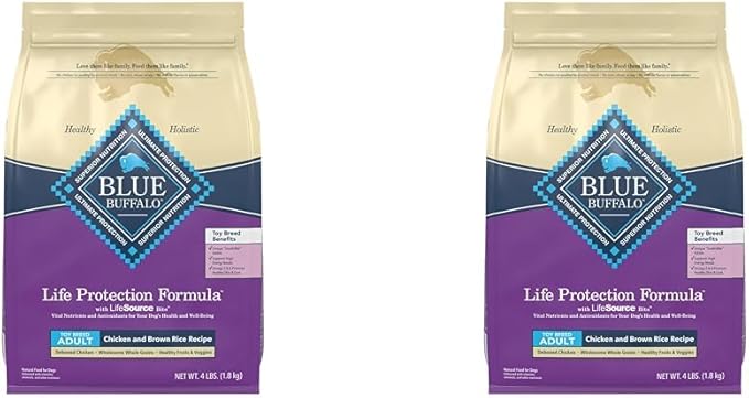 • PACKAGING MAY VARY: Contains one (1) 4 lb. Bag of BLUE Life Protection Formula Toy Breed Adult Dry Dog Food, Chicken and Brown Rice