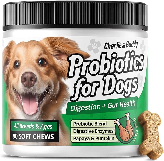Charlie & Buddy Pet Probiotics for Dogs Aid Gut Flora, Dog Probiotics for Digestive Health with Digestive Enzymes, Pumpkin, and Papaya for Upset Stomach, 90 Soft Probiotic Chews for Dogs, Duck Flavor