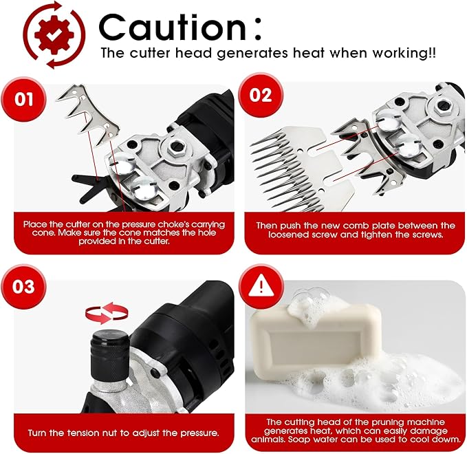• CAUTIONS - There's no lubricating oil in the bottle due to the international transportation. If you need it, please contact us. Remember to lubricate the blades and avoid long time idle to prevent the blades from overheating. Please use a cooling spray every few minutes, take a short break while shearing, and clean the blades in time. Please read the operating instructions carefully before use.