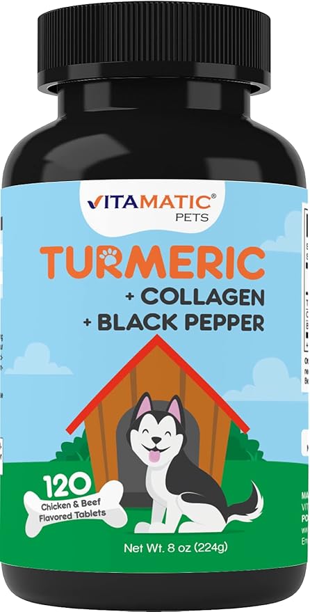 Vitamatic Turmeric for Dogs Anti Inflammatory Pain Relief - 120 Chewable Tablets - Hip & Joint Support Anti Inflammatory for Dogs with Curcumin, Collagen & Black Pepper