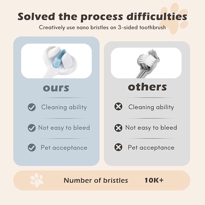 • 【Nano Bristles】: Ultra-soft nano bristles ranging from 0.07mm to 0.1mm guarantee deep cleaning between teeth without irritating your pet's sensitive teeth and gums. This leads to higher acceptance among dogs.